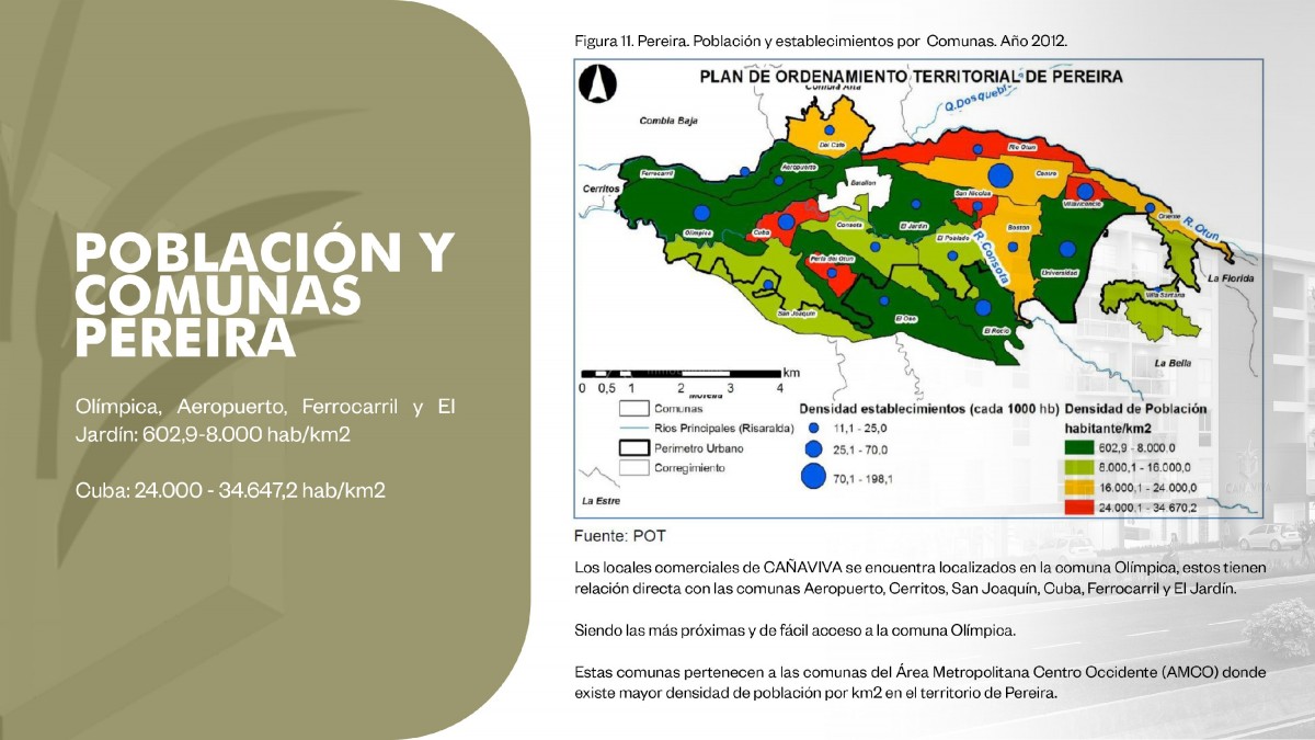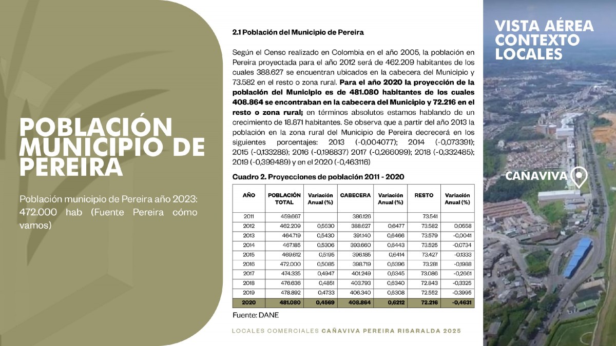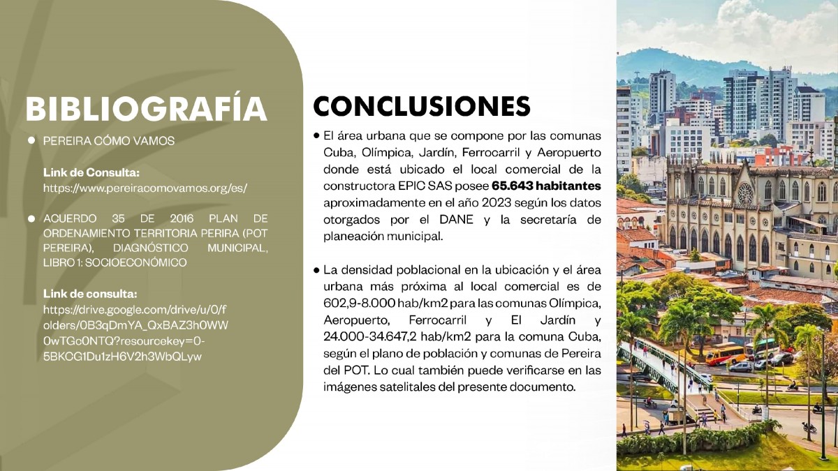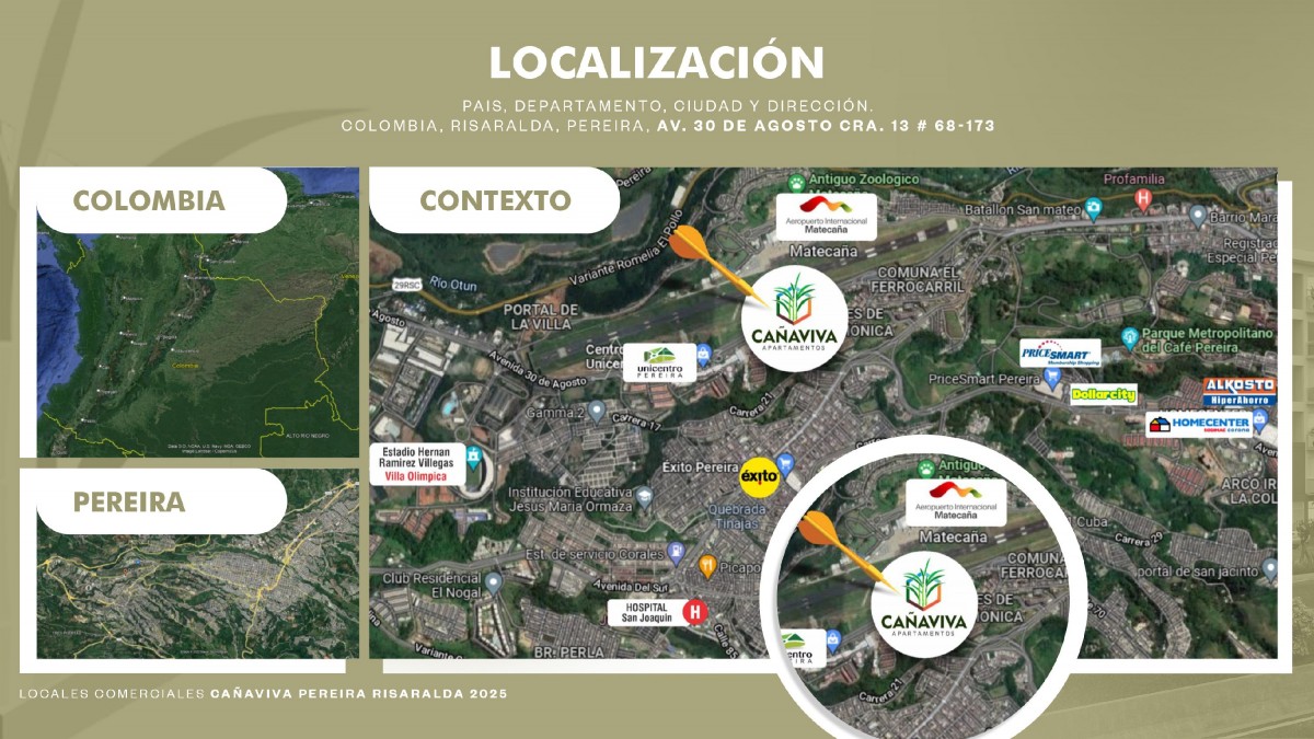 El sector donde se desarrolla el proyecto se caracteriza por su proyección de valorización y crecimiento urbano. Pereira cuenta con una población aproximada de más de 470.000 habitantes, con una expansión constante en su desarrollo inmobiliario, lo que fortalece la demanda de espacios comerciales en zonas estratégicas de la ciudad. Adicionalmente, el proyecto se encuentra cercano a sectores consolidados como La Villa, Cerritos, Avenida 30 Agosto, y frente a el Aeropuerto Internacional Matecaña, zonas que concentran una importante densidad poblacional y actividad económica. Esto permite una gran conectividad con diferentes puntos de Pereira y facilita el acceso tanto para residentes como para visitantes.