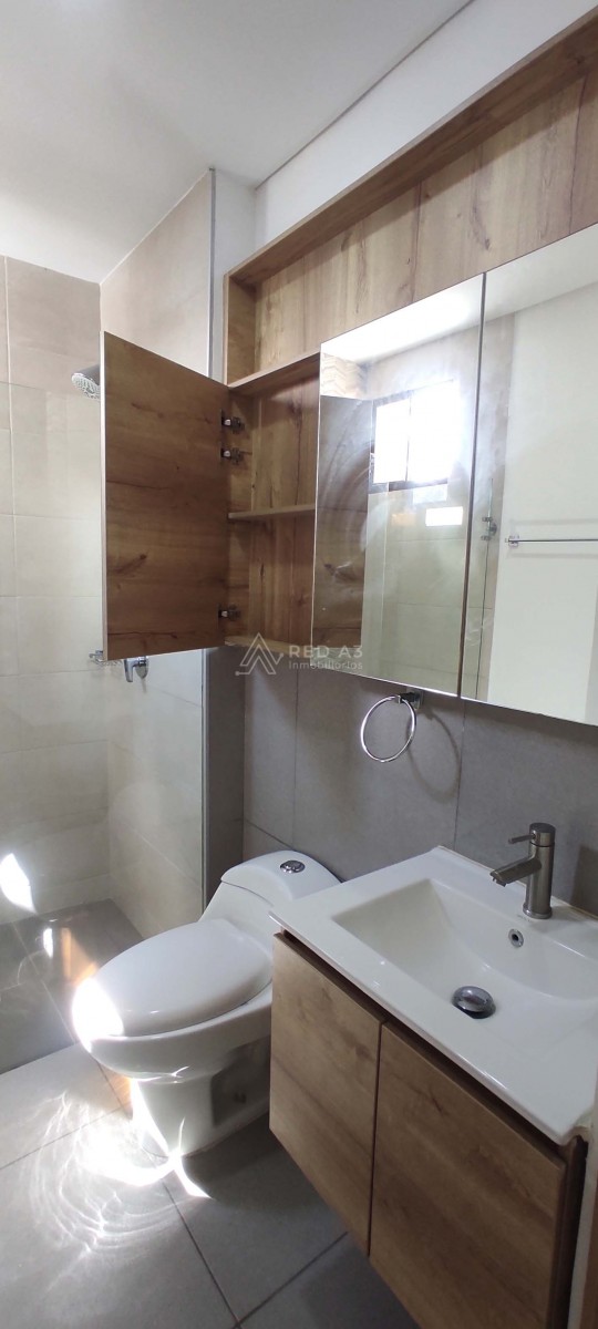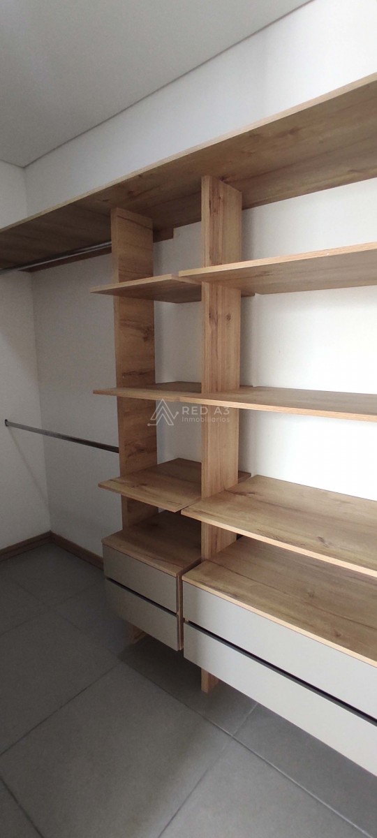Cocina integrada a sala comedor con buenos espacios para almacenamiento y barra americana