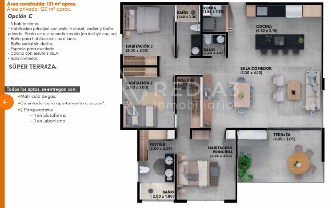 El apartamento se encuentra en piso 18 y cuenta con un área construida de 130 m², distribuidos de manera funcional y elegante: