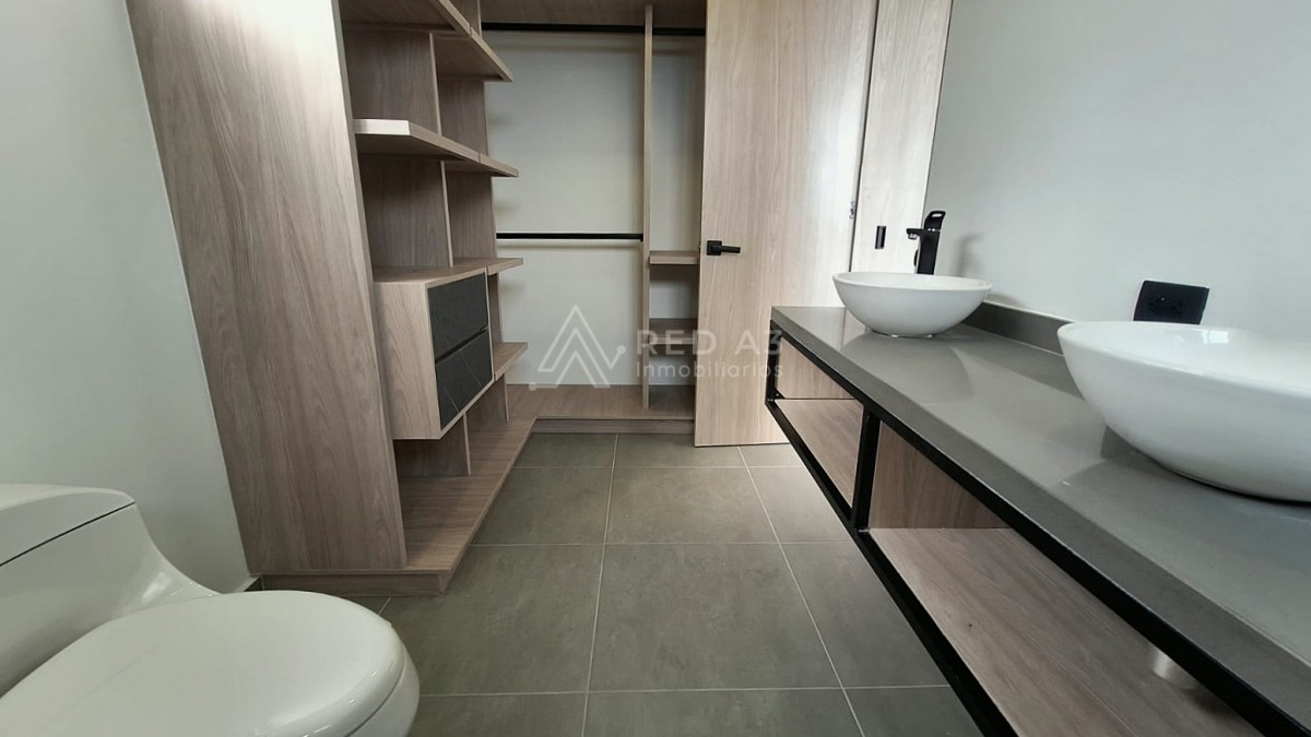 Habitación principal de 12 m² (3.45 x 3.54), con baño privado, vestier y closet en madera de piso a techo.