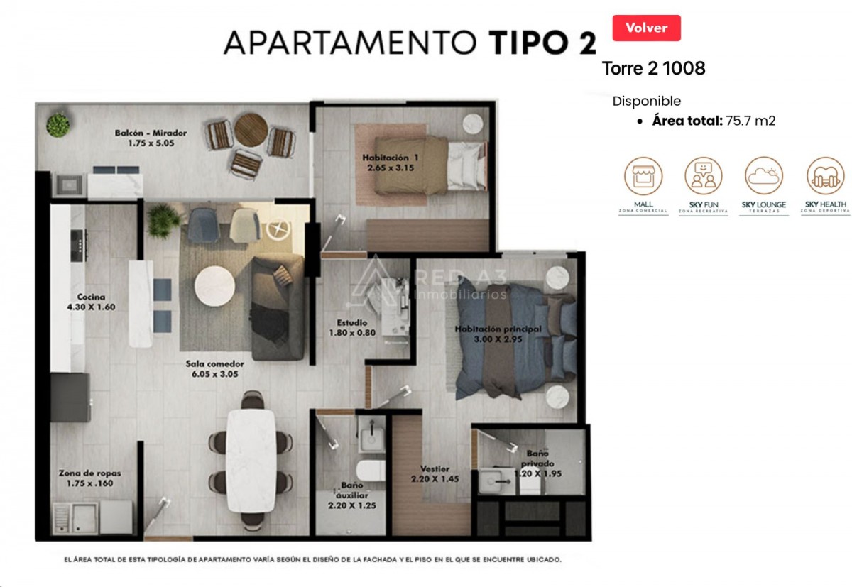 El apartamento en cesión está ubicado en la Torre 2,  piso 10, es medianero y cuenta con 75.7 m2, 2 habitaciones y 2 baños, cocina, zona de ropas, sala comedor, estudio, balcón con mirador y se entrega completamente terminado. Además, cuenta con un parqueadero en sotano. La fecha estimada para entrega es para julio de 2026.