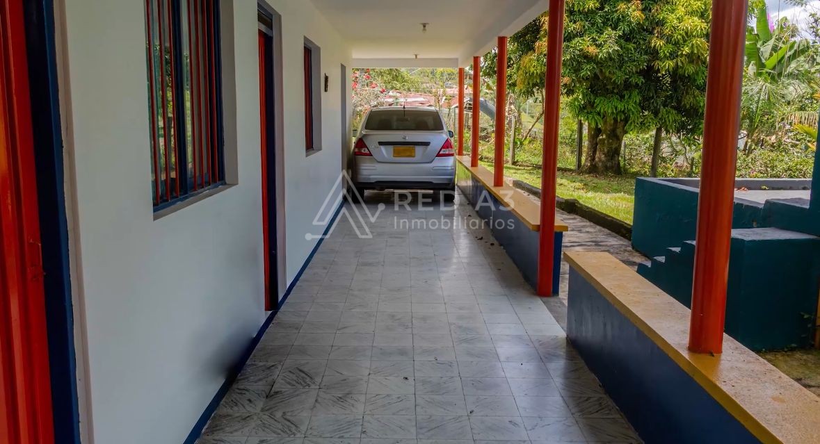 Esta es una casa campestre, sobre un lote de 10.294 metros cuadrados, con 350 m2 construidos, de dos niveles independientes, con 5 habitaciones sala comedor, cocina corriente, en cada piso, dos baños, con amplios corredores o zaguanes cubiertos en su entorno, rodeada de naturaleza, a 150 metros de la vía principal Pereira-Marsella por carretera plana destapada.