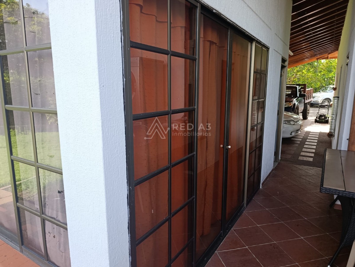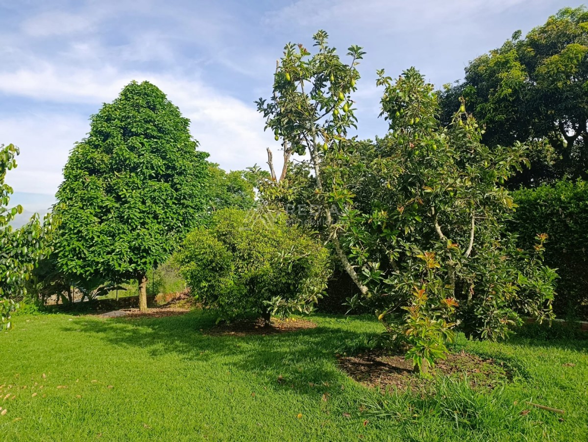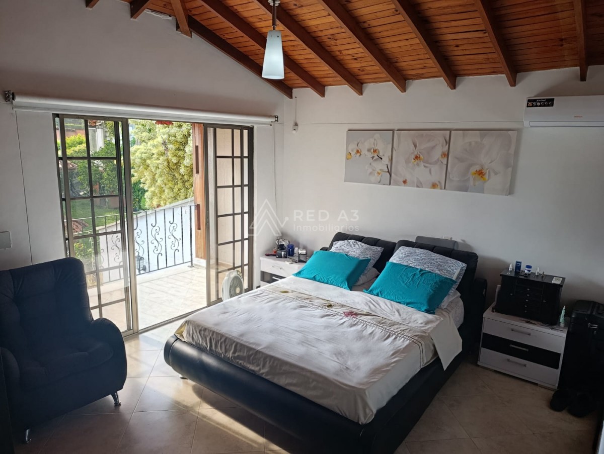 La casa principal presenta una arquitectura tradicional con techos a dos aguas y detalles en madera que le aportan un toque rústico y acogedor. Dispone de espacios amplios, ventilados e iluminados, con ventanales que permiten apreciar el paisaje circundante. En el jardín se pueden observar árboles frondosos, palmas y coloridas plantas ornamentales, que crean un ambiente de serenidad y contacto con la naturaleza.