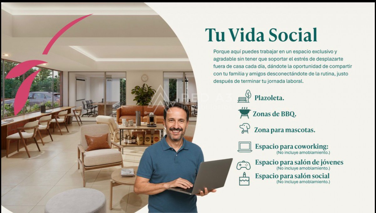 La propuesta se complementa con una completa oferta de amenidades que elevan la calidad de vida. Piscinas para adultos y niños, gimnasio dotado, zonas de coworking, juegos infantiles, áreas BBQ y espacios para mascotas hacen parte de un entorno pensado para disfrutar, compartir y relajarse sin salir de casa.